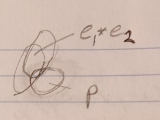 Then e would be something different. E then cannot be in coincidence with p, if we redefine coincidence as the starting together or coming together of two or more points. so we invent a way for the entities to be together and call it sharing, E*p is e sharing with p . Sharing is a way for two items to come together or be defined together and not combine. This should be possible as seen in the analogy of the overlapping shadows.