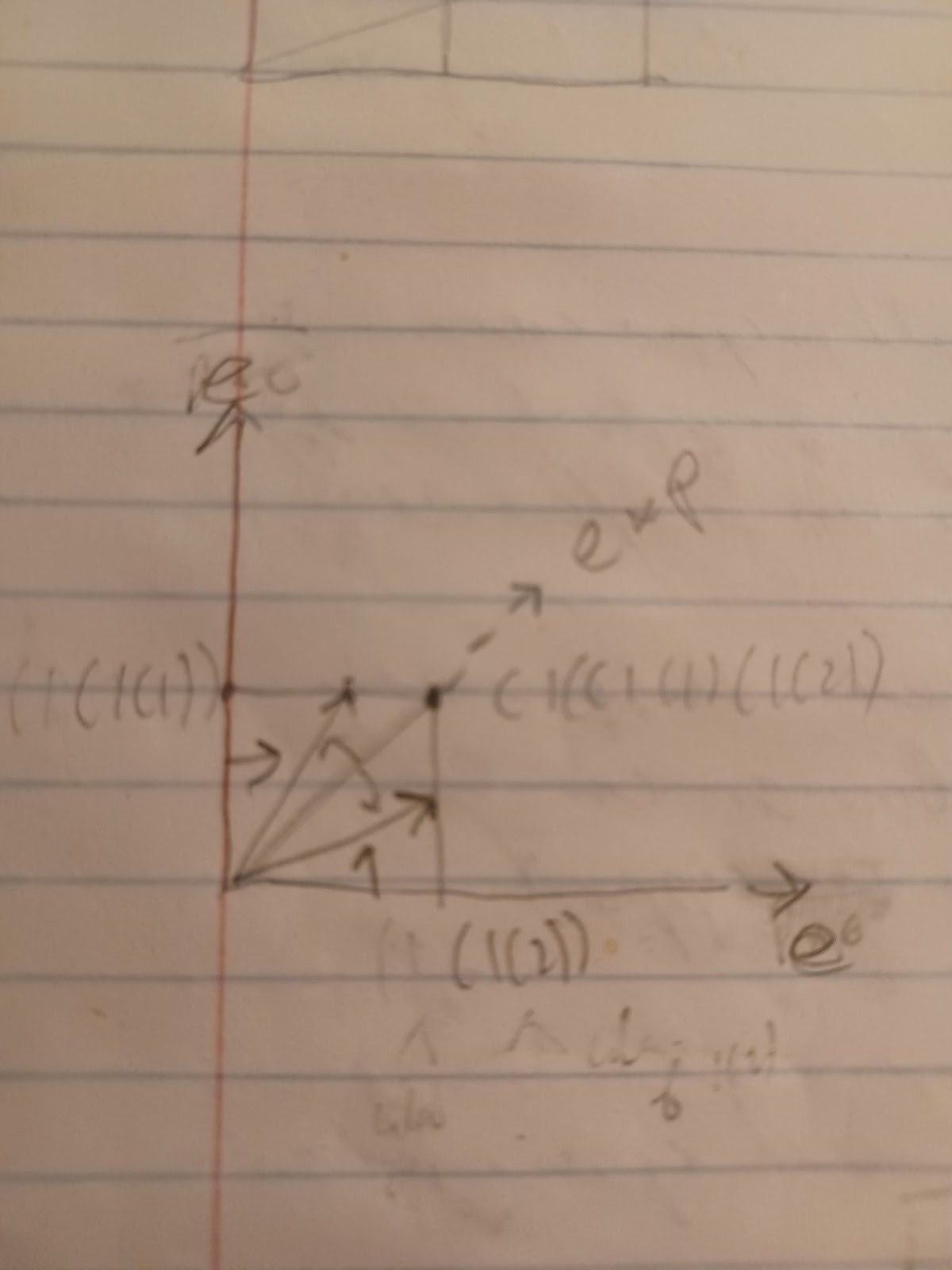 The other case can be notated e(0)=e(0) not equal to e(1)*e(2)=e(1)*e(2) not equal to e(1)*e(2)*e(3)=e(1)*e(2)*e(3). So e is not equal to p because it exists in placement space and has this other feature which is different from the way p behaves. In placement space we have 1 or 2 or 3 e’s together and also capable of being separated to different placements.